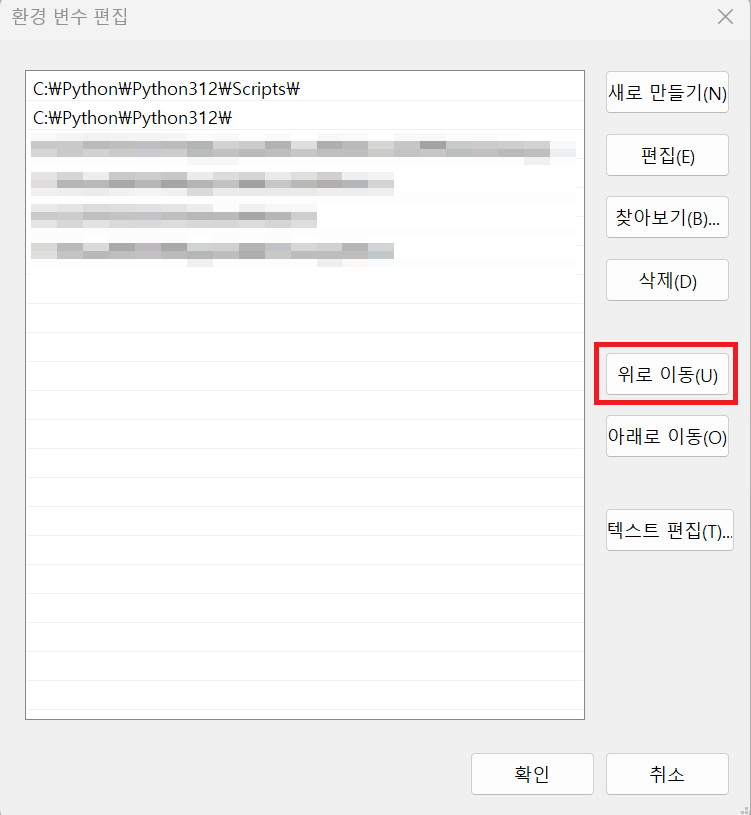 A2.환경변수 부분에 python의 우선순위를 가장 위로 올려줍니다.
